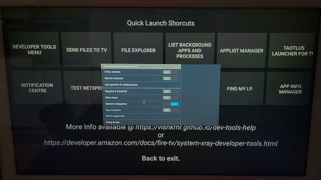 - Activate the back key on the remote control (physical or virtual), select and install “Taotlus Launcher” from the “Developer Tools Menu” screen. Also select and install (always from the same screen) “File Explorer”.