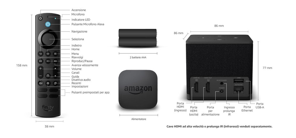 In the package you will find the power supply and two AAA batteries for the remote control. About the remote control we find the same included with the latest generation Fire TV Stick 4K (in the image above), there are no programmable keys of the latest version (Alexa Pro) which was presented right together with the Cube.