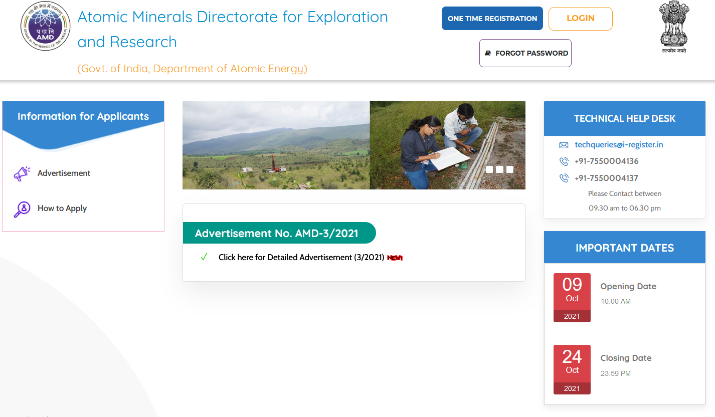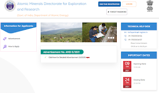 Government of India, Department of Atomic Energy (DAE), Atomic Minerals Directorate for Exploration and Research (AMD / AMDER) invites online applications from eligible candidates for appointment of following Scientific Assistant, Technician, Clerk, Driver and Security Guard positions. The last date for submission of applications is 24th October 2021.