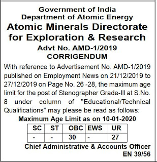 Department of Atomic Energy Recruitment 2020: Atomic Minerals Directorate for Exploration & Research (AMD) Hyderabad invites online applications from dynamic and result oriented young personnel Indian citizens for appointment of Scientific Officer, Scientific Assistants, Technician, Stenographer, Upper Division Clerk and Driver posts in AMD. The last date for submitting online application form is 10th January 2020.