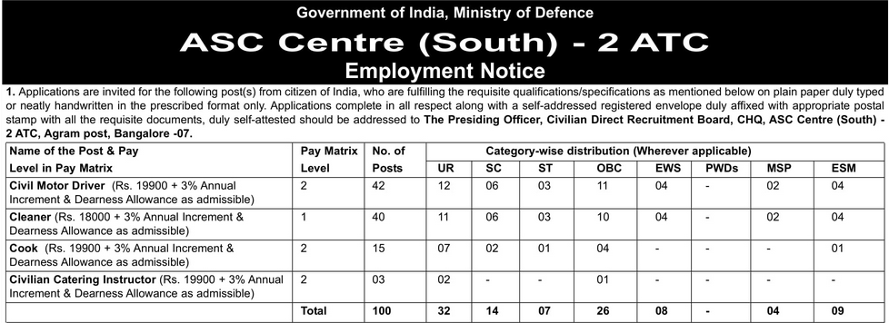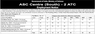 ASC Centre South 2 ATC Recruitment 2021: Government of India, Ministry of Defence, ASC Centre (South), 2 ATC, Bangalore invites applications from eligible Indian Citizens for recruitment of following Group C Posts – Civil Motor Driver, Cleaner, Cook and Civilian Catering Instructor positions. Application Form in prescribed format, Eligible persons apply within 21 Days form the date of advertisement in Employment News Paper dated 12th June 2021 Issue.