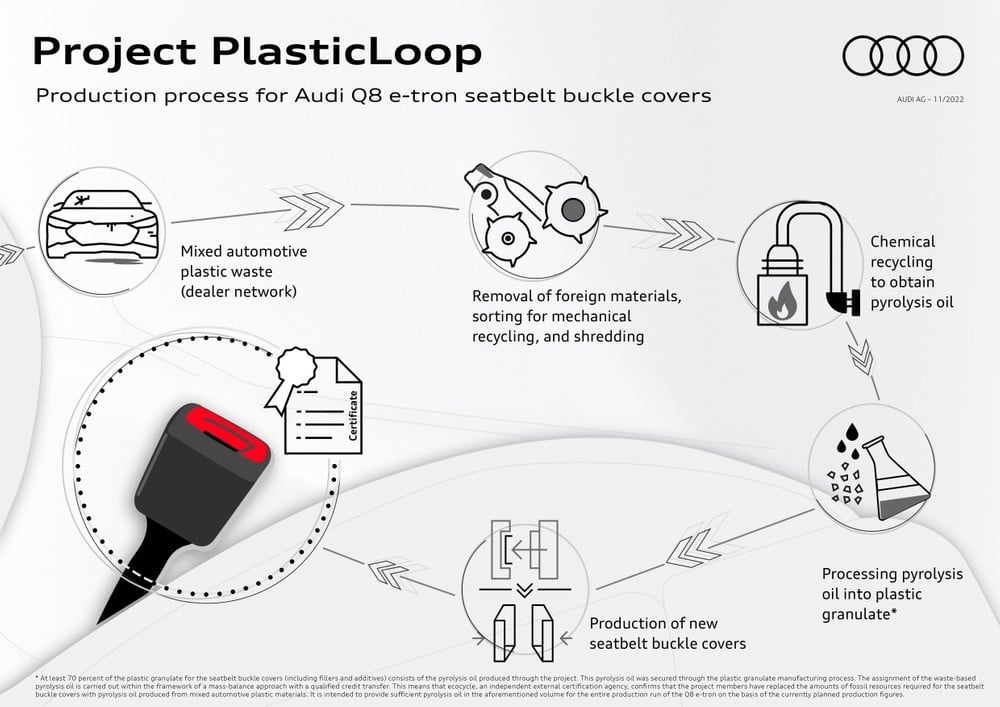 Audi goes on to state that, subsequently, the pyrolysis oil is introduced in the production process of the new plastics according to a defined approach of the “mass balance”. At least 70% of the granulate intended for the production of seat belt buckle covers thus consists of pyrolysis oil. A percentage certified by ecocycle, an independent agency that monitors the replacement of the fossil resource with the secondary product.