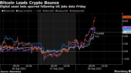 The largest cryptocurrency by market value rose as much as 4% above the $24 000 mark by mid-morning trading in London, while Ether was up 3% at around $1 770. The sector was buoyed alongside similar moves in European stocks and US equity futures after the strong payrolls print suggested the world’s biggest economy may avoid a hard landing even as the Federal Reserve tightens aggressively.