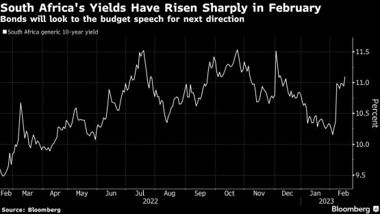 South Africa’s local-currency bonds have dropped 5.5% in February. That’s more than double the average 2.1% decline in a Bloomberg index of emerging-market peers. The yield on 10-year notes has risen about 98 basis points in that time to 11.31%, the highest since December 2.