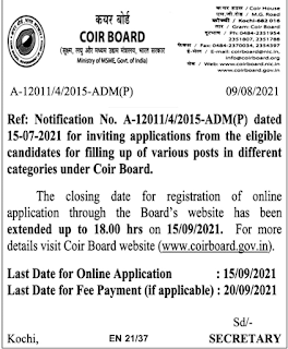 How to Apply: Eligible Interested candidates should apply online through Coir Board website @ http://coirboard.gov.in. The last date for registration of online applications is 15/09/2021 up to 6:00 PM. The last date for paying application fee is 20th September 2021.