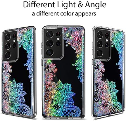 [Shiny bling lace]Beautiful 3D shiny glitter bling lace flower in white silver color, iridescent sparkly in the sun or other light sources, showcase your individuality and be the center of attention with this stunning Clear case;Cute Designed for charming girls women ladies;looks cool and attractive with fashion trend Henna Floral; Different Angle looks White and Different Angle looks Silver due to sparkle Bling finish