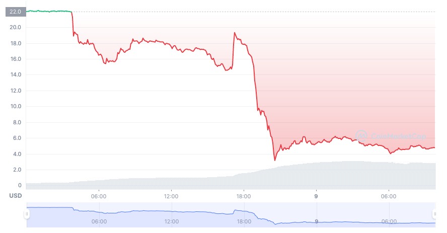Immediate effect: the FTT valuethe FTX token, from 22 it drops to 15 dollars in 4 hours, then goes back up to almost 19 dollars before collapsing in 3 hours under $ 4 due to FTX suspending customer withdrawals. It now looks stable around $ 4.8, but in 24 hours more than 85% of the dollar value went up in smoke.