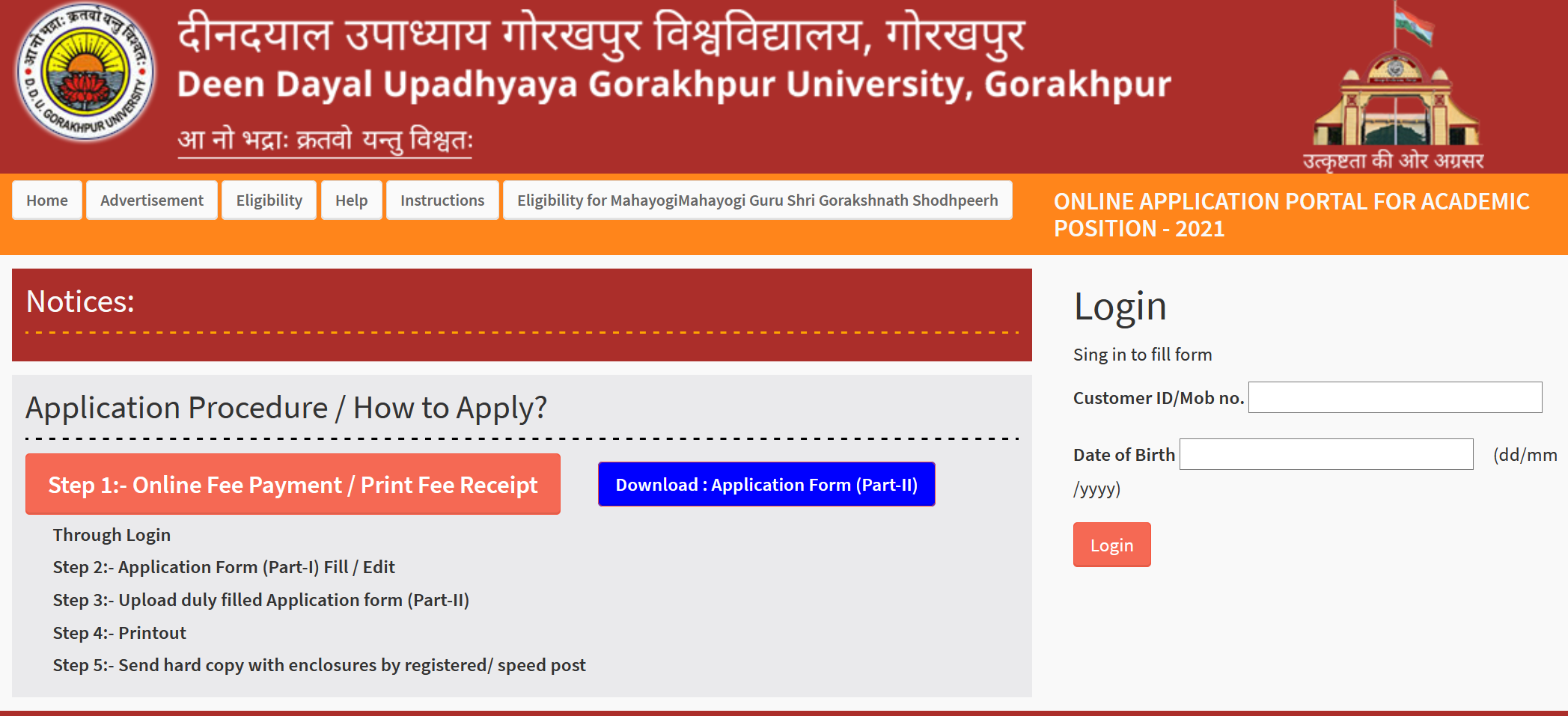 ✅ How to Apply: Eligible interested candidates should apply online through DDUGU Official website (ddugu.ac.in). The applicant shall download the Application Form (Part I & II) after completing the on-line procedure and send it after signing all the pages of Application Form (Part I & II) by Registered/ Speed post at the given postal address along with the self attested testimonials on or before 10/06/2021 to the following address: Assistant Registrar (RAC), Admin Building, DDU Gorakhpur University, Gorakhpur. For any queries email to recruitment.helpddu21@gmail.com.