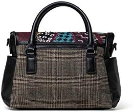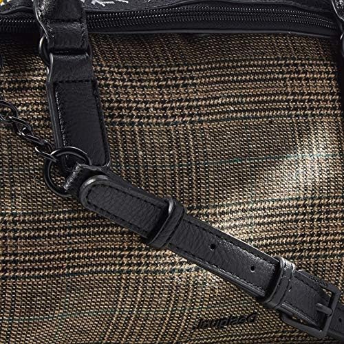 Handbag with two short handles, long strap with chain, zip and a small pocket in its central compartment.