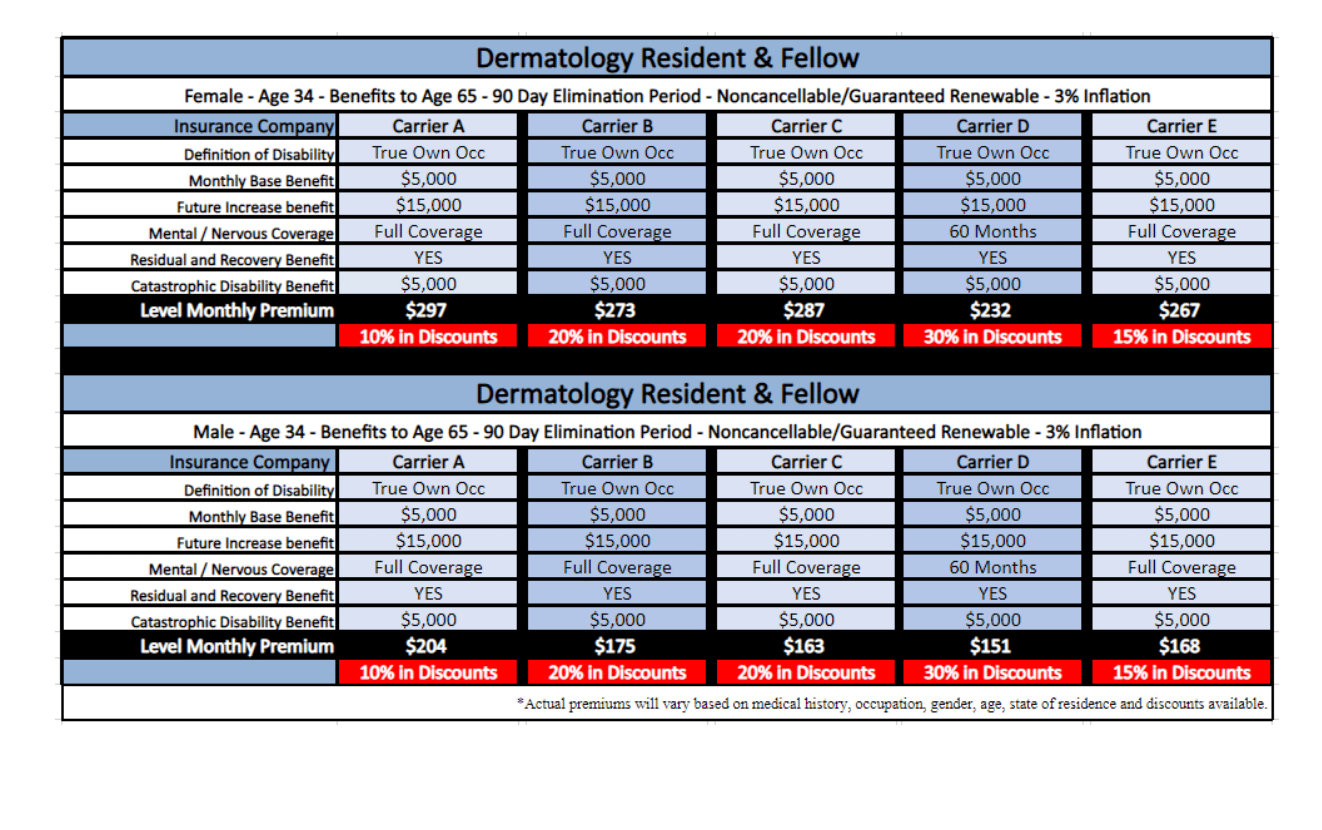 The chart above includes prospective rates from partner PKA Insurance for dermatology residents and fellows. As you can see, for a base benefit of $5,000, premiums could range from $151 to $297 depending on gender and carrier.