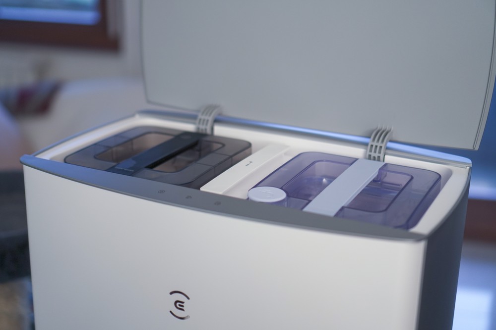 The flap in the upper part gives access to two tanks of four liters each, one for clean water, the other for collecting residues and dirty water. The washing base allows not only to wet the clothes at intervals decided by the user, but also to wash and sanitize the mops, which are then dried by the same with a flow of hot air.