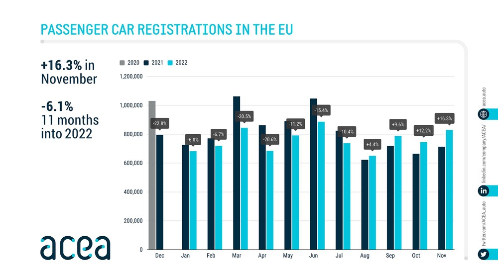 For the European car marketthe month of November 2022 closed positively. This is the fourth consecutive positive month after a year with only minus signs. Going into the details communicated by ACEA last month, at European Union level, they are 829,527 cars were registeredequal to a growth of 16.3% on 2021 (713,273 registrations).