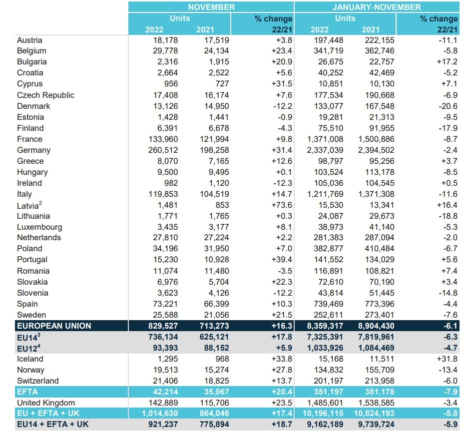 Despite the recovery of the last period, on 2022as a whole, continue to be negative. In fact, at the European Union level, the first 11 months of the year recorded a drop of 6.1% compared to 2021. Considering the United Kingdom and the EFTA countries, we are at -5.8%.