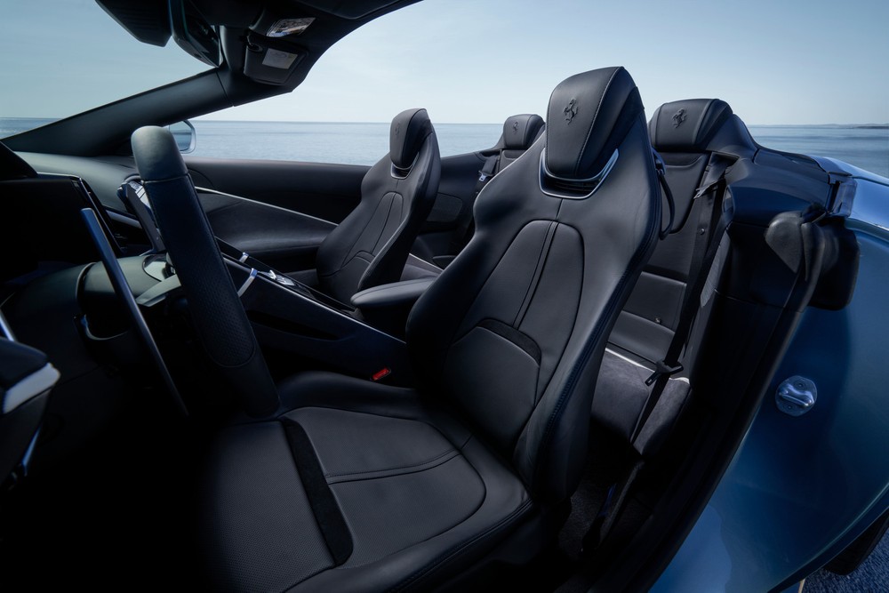 Gli interni sono sostanzialmente quelli della Ferrari Roma. Troviamo, quindi, un quadro strumenti digitale e uno schermo centrale da 8,4 pollici con supporto ad Apple CarPlay e Android Auto. Tra gli optional è presente uno schermo dedicato al passeggero anteriore dal quale è possibile visualizzare le principali informazioni sulla marcia.