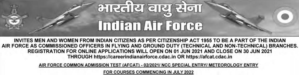 AIR FORCE COMMON ADMISSION TEST (AFCAT- 02/2021) FOR FLYING BRANCH AND GROUND DUTY (TECHNICAL AND NON-TECHNICAL) BRANCHES/ NCC SPECIAL ENTRY FOR COURSES COMMENCING IN JULY 2022