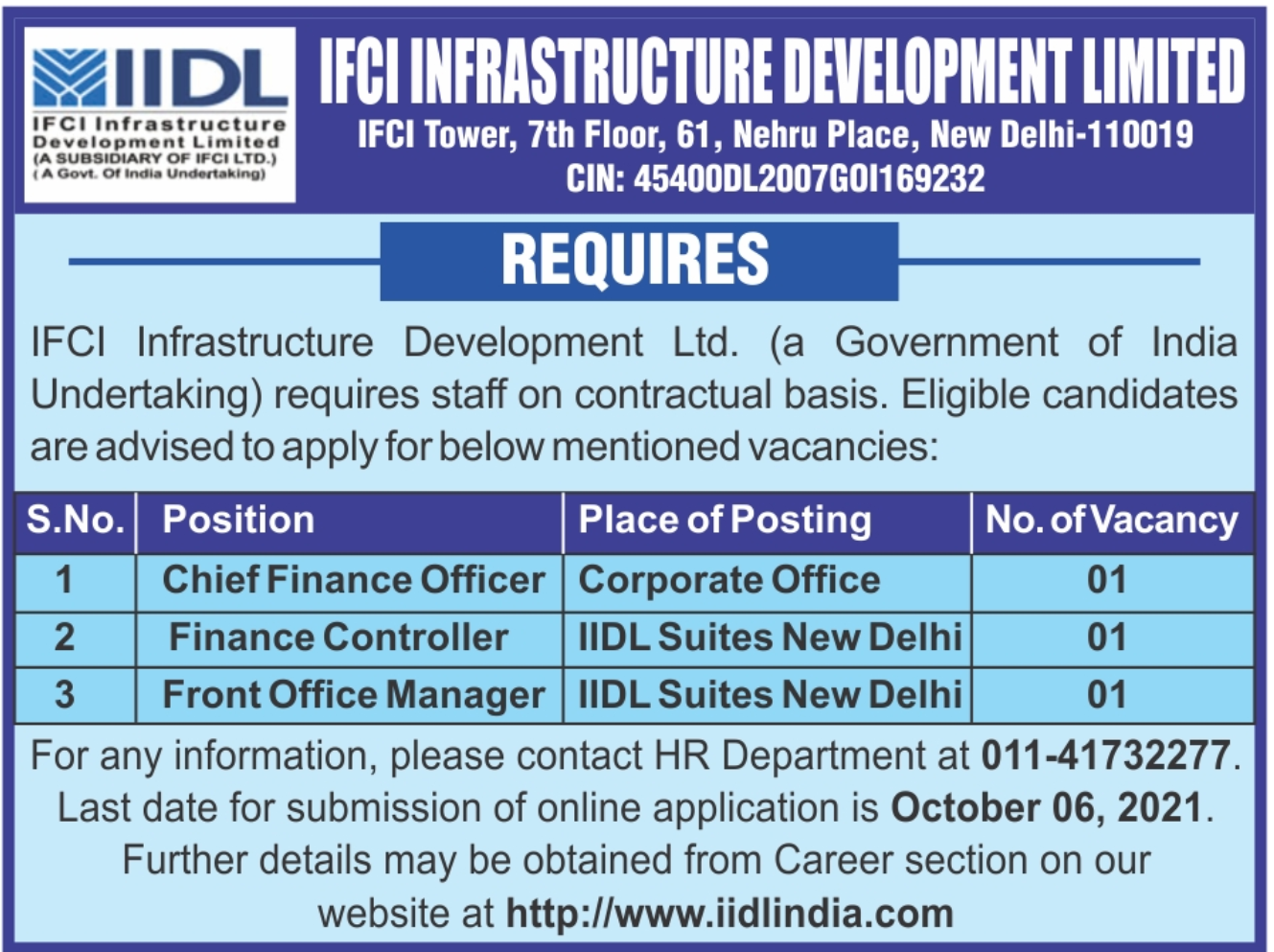 IIDL Recruitment 2021 iidlindia.com: IFCI Infrastructure Development Limited (IIDL) New Delhi invites applications for requirement of Chief Finance Officer, Finance Controller and Front Officer Manager on contractual basis. The last date for receipt of applications is 6th October 2021.