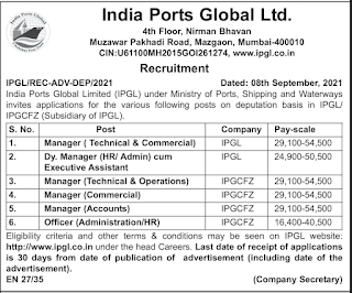 India Ports Global Limited (IPGL), Mumbai invites applications from eligible officials for recruitment of Manager, Deputy Manager and Officer posts on deputation basis in IPGL / IPGCFZ (Subsidiary of IPGL). Apply within 30 days from the date of advertisement in Employment News paper dated 2nd October 2021 Issue.