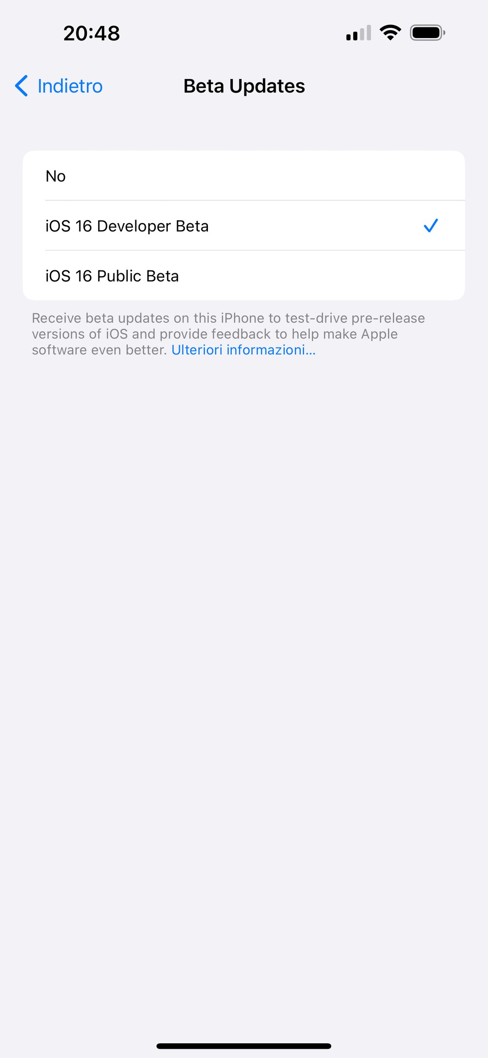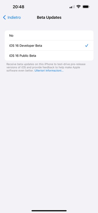 Access to the beta program, as stated in the release notes published by Apple, will therefore be adjusted directly from the iOS Software Update menu (and other OS), where there is now a new entry explicitly dedicated to receiving betas. Here, as we can see from the images shown below, it is possible to choose whether to take part in the developer program, in the public program or to stop receiving updates.