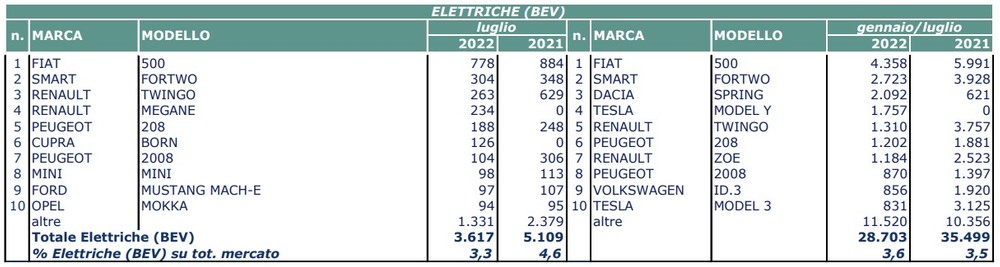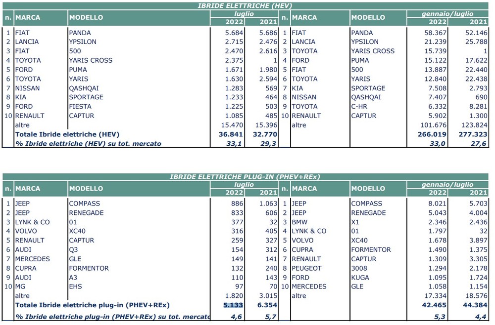 PHEV models can count on a 4.6% share with a volume decrease of 19.2% on 2021, while BEVs stop at 3.3% market share with a -29.2% in terms of volumes . Well, on the other hand, the hybrids (HEV) that reach 33.1% share. But what were the most popular models among the electrified (electric, Plug-in and hybrid) in July 2022?