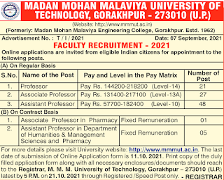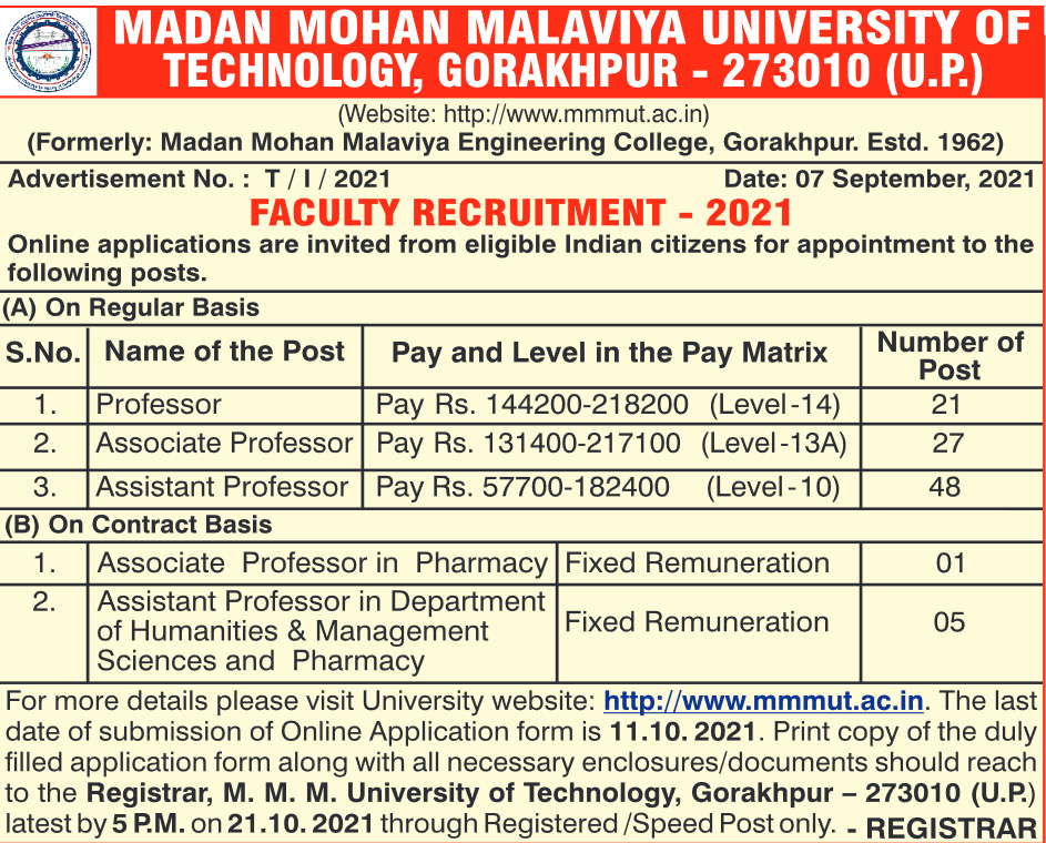 MMMUT Faculty Recruitment 2021: Madan Mohan Malaviya University of Technology (MMMUT), Gorakhur invites online applications from eligible candidates for recruitment of faculty positions (Professor, Associate Professor and Assistant Professor) in various departments. The last date for submission of online applications is 11th October 2021.
