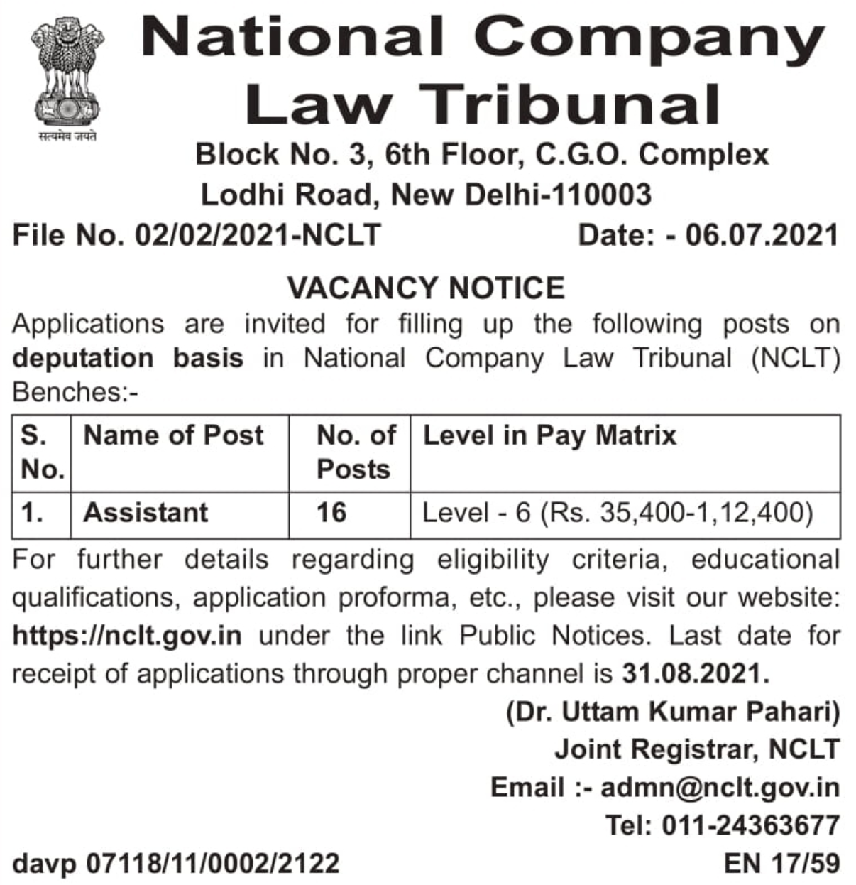 For further details regarding eligibility criteria, educational qualifications, application proforma etc., please visit NCLT official website. The last date for receipt of applications through proper channel is 31/08/2021.