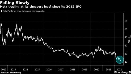 Meta Platforms Inc. now features in the list of the 15 cheapest stocks in the tech-heavy Nasdaq 100 index. Shares of the Facebook owner have fallen more than 50% this year, erasing $483 billion in market capitalization. The world’s biggest social media company, which is battling to keep growing its user base, trades at 12 times forward earnings, its lowest level as a public company. Meta shares were trading 3% higher at Tuesday’s open.