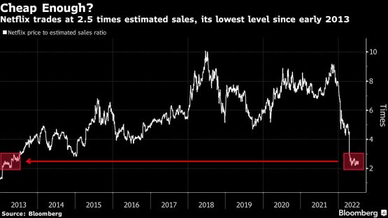The stock price already reflects plenty of bad news, though, so a better-than-expected quarter might spark a rally: Netflix trades at 2.5 times estimated sales, its lowest level since early 2013 and well below its 10-year average of 5.4 times. In comparison, the Nasdaq 100 Index is priced at 3.6 times forward sales.