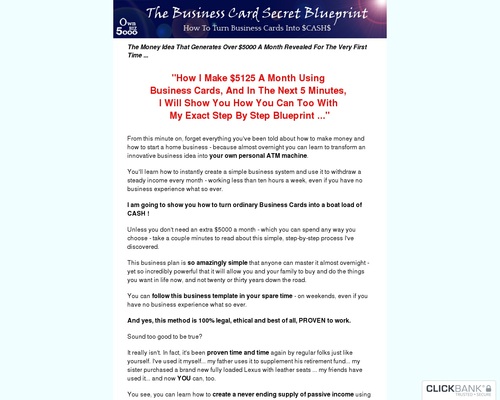 Description: 75% Commission On Hot New Product With Upsell ! This New Ebook Shows People How To Take Ordinary Business Cards That They Have Lying Around The House And Turn It Into A Monthly Income. High Converting Sales Page !