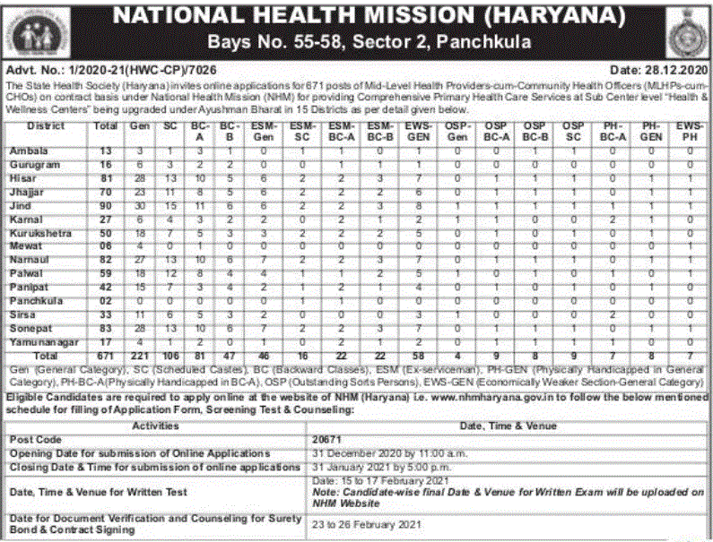 NHM Haryana MLHP Recruitment 2021: National Health Mission (NHM) Haryana invites online applications for recruitment of 671 posts of Mid Level Health Providers cum Community Health Officers (MLHPs cum CHOs) on contract basis under NHM for providing comprehensive Primary Health Care services at Sub Center level “Health & Wellness Centers” being upgraded under Ayushman Bharat in 15 districts. The last date for registration of online applications is 31st January 2021.