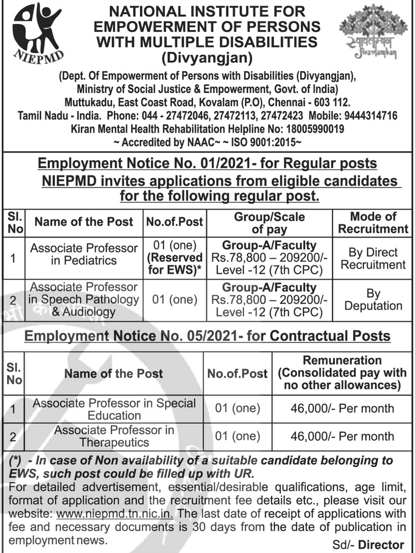 NIEPMD Recruitment 2021: National Institute for Empowerment of Persons with Multiple Disabilities (NIEPMD) (Divyangjan) invites applications from eligible candidates for recruitment of Associate Professors on regular basis. Apply within 30 days from the date of advertisement in Employment News dated 14th August 2021 Issue.