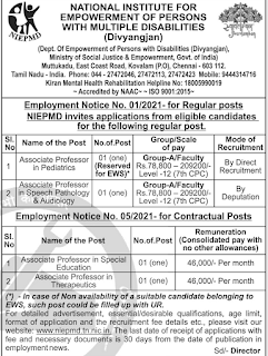 How to Apply: Eligible candidates apply in prescribed application format. The application duly filled up the relevant columns, signed and enclosed with the self-attested copies of educational, professional, additional qualifications and experience certificates should be sent to “THE DIRECTOR, NATIONAL INSTITUTE FOR EMPOWERMENT OF PERSONS WITH MULTIPLE DISABILITIES, NIEPMD, ECR, MUTTUKADU, KOVALAM POST, CHENNAI-603 112 (TAMILNADU). The last date will be 01/11/2019.