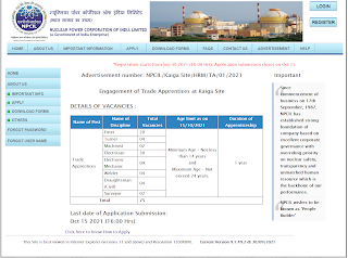 ✅ How to Apply: First, the candidate has to register himself at the web portal of Ministry of Skill Development and Entrepreneurship http://www.apprenticeship.org/ or http://www.apprenticeship.gov.in/ have to apply for the respective trade. Before applying, the candidate shall ensure his/her eligibility for apprentice training. After registration in the Apprenticeship Web Portal, the candidate shall apply and submit the application form available in the NPCIL website from 30/09/2021 at 10:00 hrs to 15/10/2021 at 16:00 hrs.