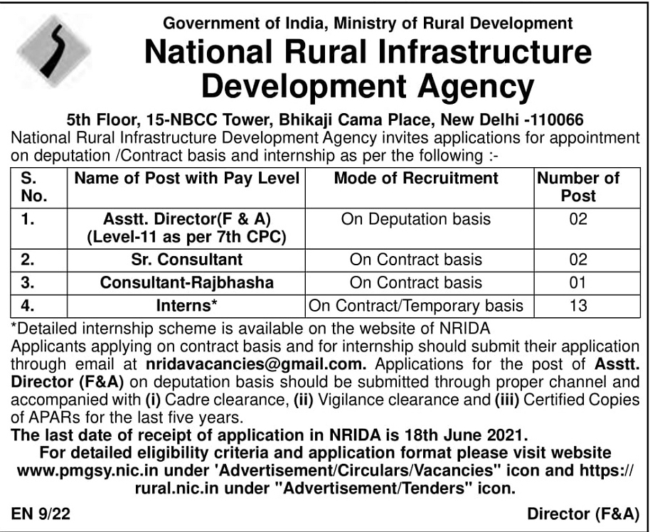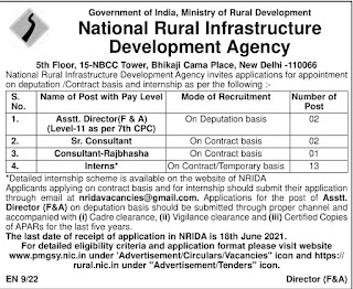 NRDA Recruitment 2021: Government of India, Ministry of Rural Development, National Rural Infrastructure Development Agency (NRIDA), New Delhi invites applications from eligible candidates for appointment of Assistant Director, Senior Consultant, Consultant and Interns on Contract / Temporary / Deputation Basis.