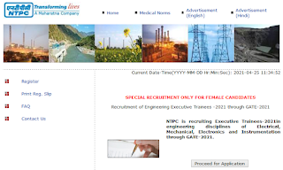 NTPC Particular Recruitment of Feminine Engineering Govt Trainees-2021 via GATE 2021 (Commercial No. 04/21)