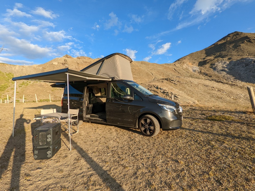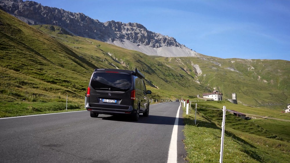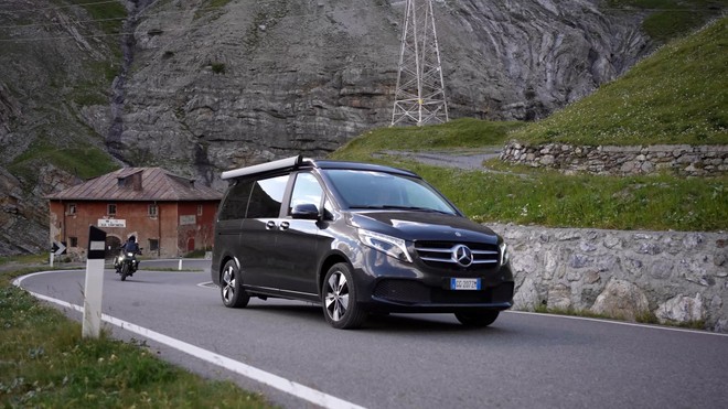 Our model, in addition to the camper set-up (living area with table, swiveling front seats, autonomous diesel air heating, rear seats that can be converted into a bed, folding sunroof with bed, kitchenette, 40-liter refrigerator box, various storage compartments storage, wardrobe, external connections for electricity and water, additional battery for utilities), then had a series of tricks including activation of the electric folding roof, awning, tow hook, Airmatic suspensions, 38-liter water tank, water tank exhaust and a very complete package of technologies and ADAS (MBUX and MBAC), as well as a series of comfortable options ranging from full LED headlights to 360-degree cameras, passing through athermic glasses, hill holders, leather seats and a list of others 150 elements (really 150).