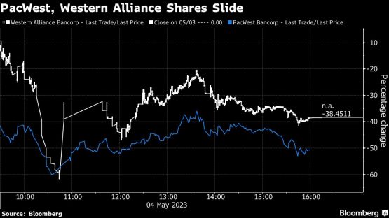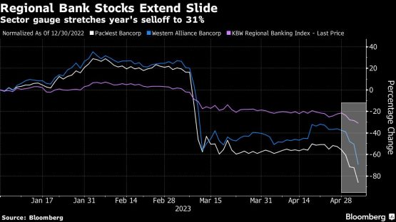PacWest Bancorp, First Horizon Corp. and Western Alliance Bancorp led a renewed slide in the shares of US regional lenders, adding to concern for a sector that’s been rattled in recent months by the collapse of multiple firms.
