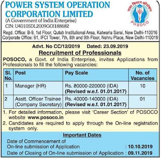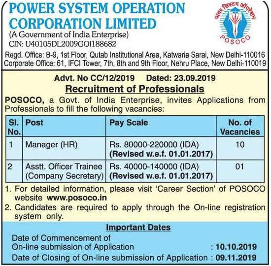 POSOCO Recruitment 2019 Free Jobs Alert for Indian Citizens both Experienced and Fresher Graduates Apply Online for 11 Vacancies in 2019-20. Power System Operation Corporation Limited (POSOCO) invites online applications from eligible professionals for recruitment of HR Manager and Assistant Officer Trainee vacancies. The online registration process will be open from 10th October 2019 to 9th November 2019.