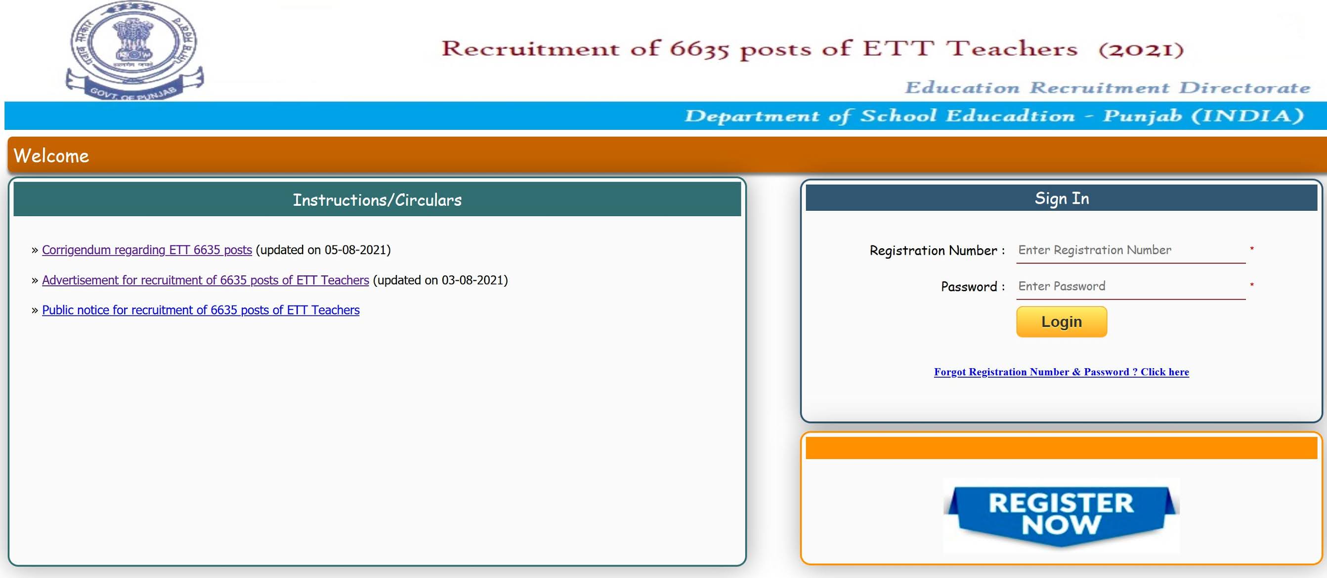Department of School Education, Government of Punjab invites online applications for recruitment of ETT Teachers for fill up 6635 vacancies. The last date for registration of online applications is 18th August 2021.