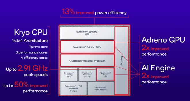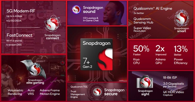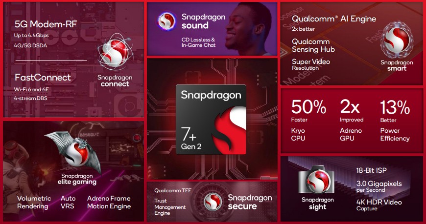 Utilizza Snapdragon 7+ Gen 2 CPU Qualcomm Kryo in configurazione octa-core (1 core principale, 3 core ad alte prestazioni e 4 core a risparmio energetico), offrendo una velocità di picco fino a 2,91 GHz e un miglioramento delle prestazioni di oltre il 50% rispetto alla generazione precedente. La GPU Qualcomm Adreno promette il doppio delle prestazioni. Il tutto con un’efficienza energetica migliorata del 13%.