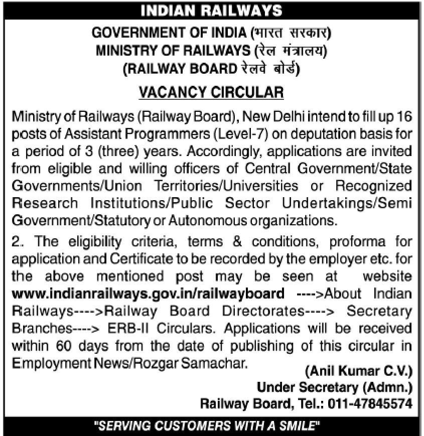 Indian Railway Board Recruitment 2020-21: Government of India, Ministry of Railways, Railway Board intend to fill up 16 vacancy posts of Assistant Programmers on 03 years deputation basis.