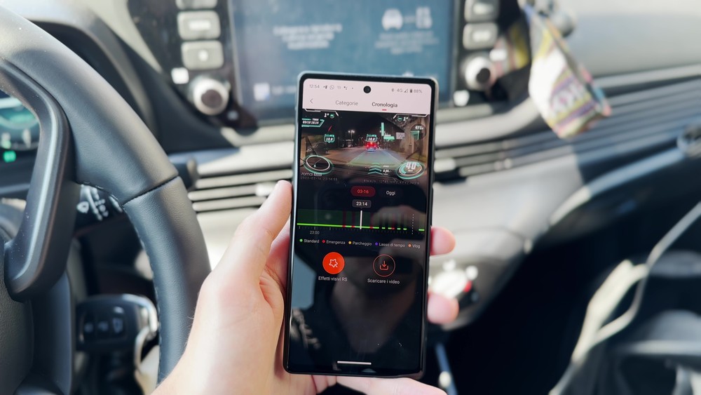 Menzione finale alle clip scaricabili tramite l’applicazione con effetti visivi applicati che, oltre ad essere molto “instagrammabili”, ci fanno capire come funziona il software della dash camera e quindi come intervengono gli ADAS. Nell’app potremo anche decidere se attivare o disattivare l’audio oltre che se allegare velocità e coordinate.