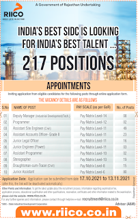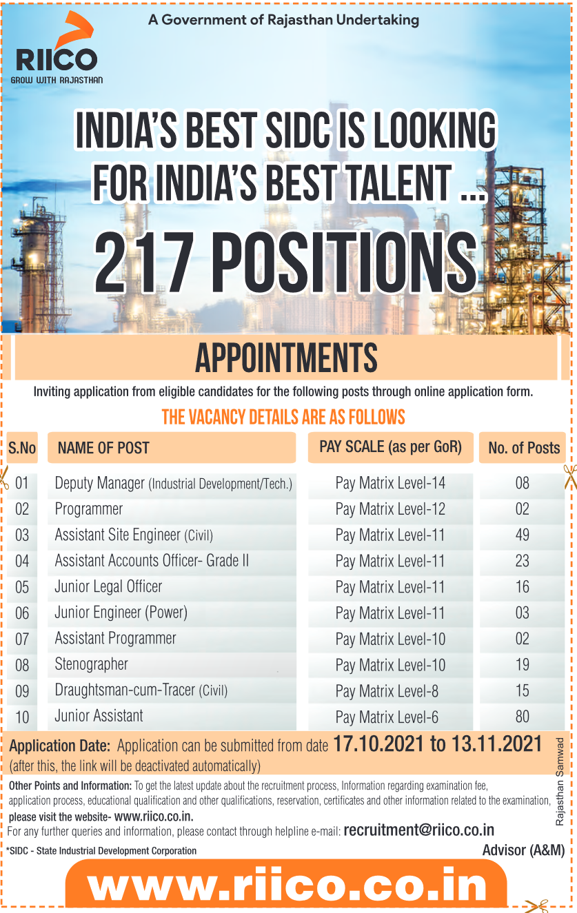 RIICO Recruitment 2021: Rajasthan State Industrial Development and Investment Corporation Limited (RIICO) (A Rajasthan state Government Undertaking invites online applications for recruitment of following Manager, Engineer, Officer, Stenographer, Draughts cum Tracer, Assistant and Stenographer posts. The last date for submission of applications is 13th November 2021.