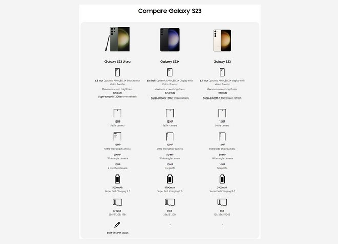 The image shown above is also due to the very active Roland Quandt who managed to capture the content of a page on the official Samsung website in which the main features of the three Galaxy S23, S23 Plus and S23 Ultra models are compared.