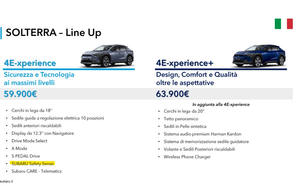 Indeed, 4E-xperience includes 18″ alloy wheels, strongly recommended both for lower fuel consumption and for off-road use, driver’s seat with electric adjustment, 12.3″ display with navigator, heated front seats, driving modes, S- PEDAL Drive (Subaru’s one-pedal driving), telematics for connecting to the app and Subaru Safety Sense, the ADAS suite for Level 2 semi-autonomous driving.