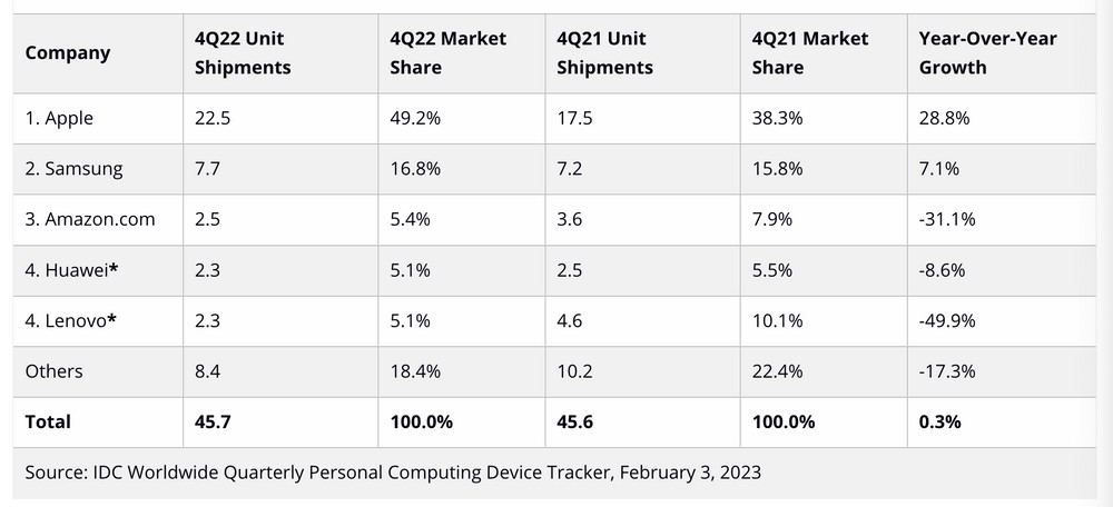The quarterly data shown above highlight the strengthened leadership of Apple which, in a negative period, manages to grow by 28.8% with a market share that rose from 38.3 to 49.2%. The iPads shipped in the October-December period were 22.5 million: in Q4 the Cupertino-based company presented the iPad Pro with M2 chip and an unprecedented basic version of the iPad, both of which were well received by the public.