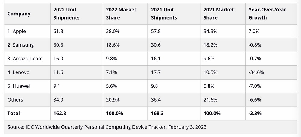 Considering the whole of 2022 the only growing brand is Apple (+7%) with a share of 38% and 61.8 million iPads shipped. The other brands are all negative, going from -0.7% for Amazon (third place, 16 million units shipped and 9.8% market share) up to -34.6% for Lenovo (fourth).