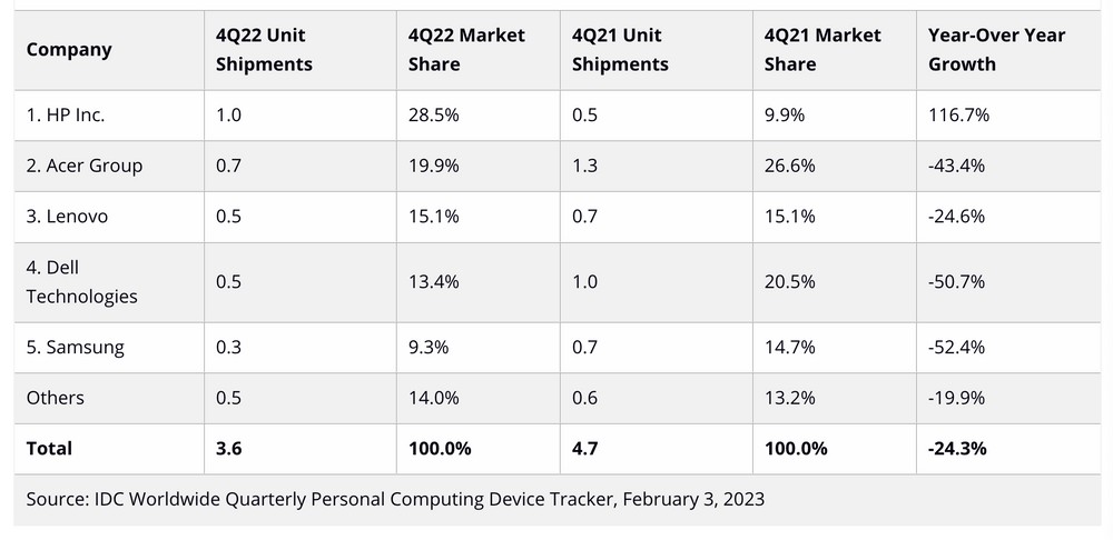 - in Q4 2022 HP grew by 116.7% with 1 million Chromebooks shipped and a share of 28.5%. They follow Acer (-43.4%), Lenovo (-24.6%), Dell (-50.7%) and Samsung (-52.4%). Chromebooks shipped overall in the last quarter were 3.6 million.