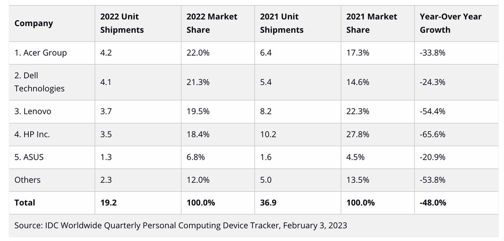 - in 2022 Acer shipped the most Chromebooks (4.2 million) despite a 33.8 percent drop. Dell ranks second (-24.3), followed by Lenovo (-54.4%), HP (-65.6%) and ASUS (-20.9%). I am 19.2 million tablets shipped overall compared to 36.9 million in 2021.