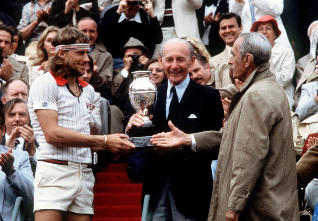 Sweden’s tennis player Bjorn Borg (left) receives the Winner’s Trophy from former tennis “musketeers” Jean Borotra (center) and Henri Cochet (right) here 09 june 1979 after defeating Italian Victor Pecci during the Men’s French Open Finals at Roland Garros stadium. (Photo by AFP)