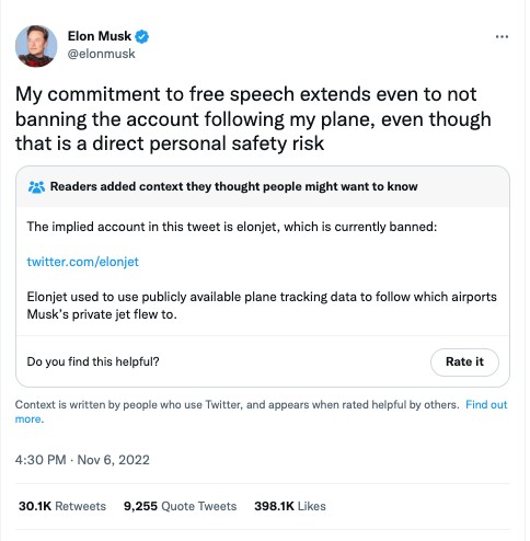 For example, it was only in November that he confirmed that his commitment to guaranteeing freedom of speech would have been testified even by willingness not to ban the account that has been tracking his personal jet for months (using publicly available information), only to then retrace his steps to invent a new rule that prohibits real-time tracking of any person on Twitter.